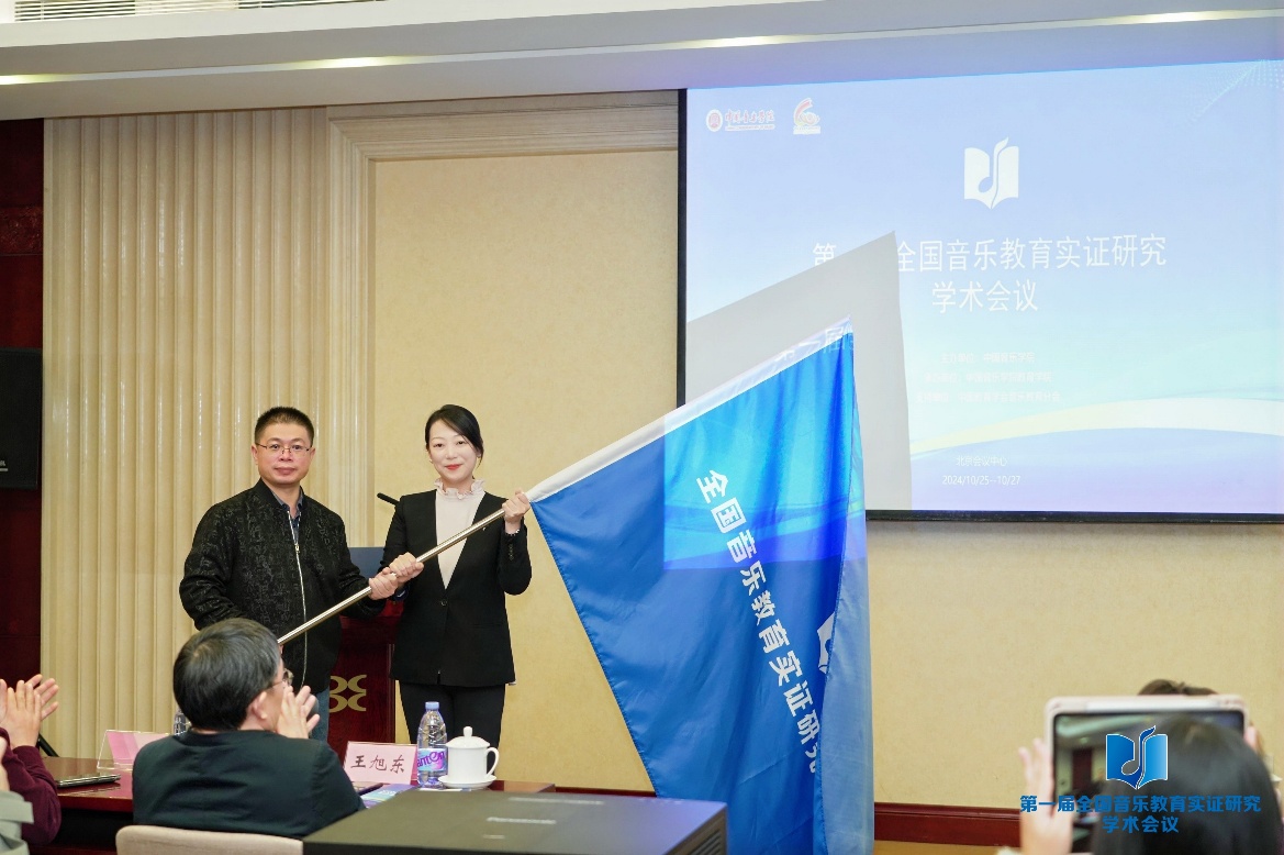 分论坛结束后,会议逐渐步入尾声。在会旗交接仪式上,浙江音乐学院音乐0638太阳集团副院长章艺悦副教授从郭彪教授手中接过象征学术传承的会旗。她满怀激动地发表感言:“很荣幸接过音乐教育实证研究学术会议的接力棒。此次会议标志着中国音乐教育研究人才培养的新起点,也为未来的音乐教育实证研究的学术交流与合作打下坚实的基础。”借此机会,章艺悦副院长向与会学者发出诚挚邀请,期待大家2025年再次相聚杭州。